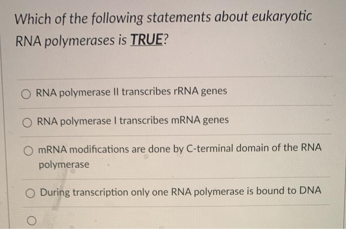 Which of the following statements is true for eukaryotic RNA polymerases. Eukaryotic ribosomes have a P site prokaryotic ribosomes do not have a site O Eukaryotic ribosomes consist of proteins and rRNA prokaryotic ribosomes do not have RNA Eukaryotic ribosomes have a large subunit and a small subunit while prokaryotic ribosomes have just one subunit Prokaryotic cells dont have ribosomes Eukaryotic ribosomes are larger than. Which of the following statements are true about eukaryotic mRNAa.